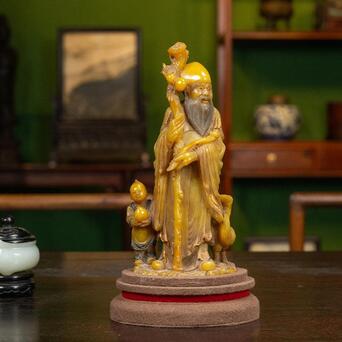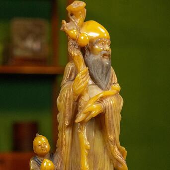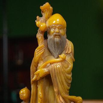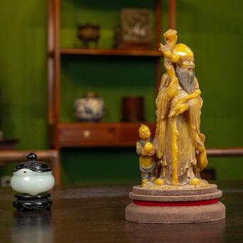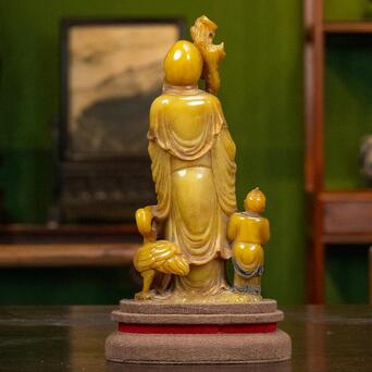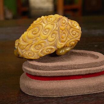 此品摆件由一整块上好的寿山石料雕成,艺术价值很高。其选用的寿山石色泽纯粹,颇似蜜蜡,郁而不沉,光华内敛,晶莹脂润,体表无裂无疵,细腻若冻脂,摩挲于手,更觉冰凉柔滑,让人爱不释手。